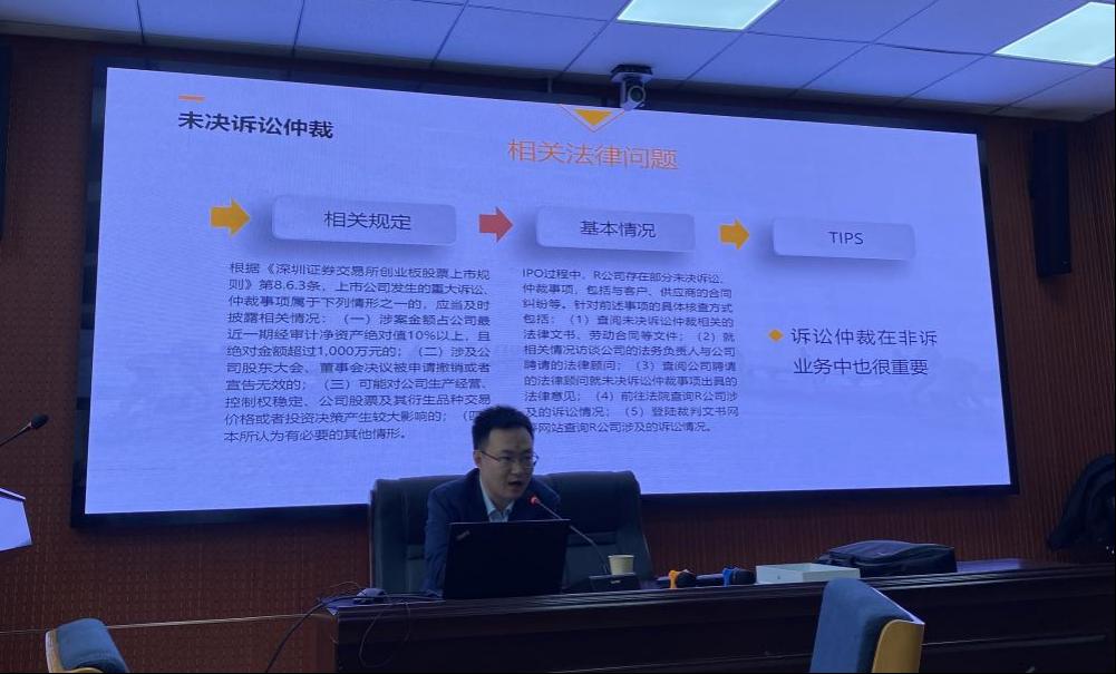 王昌杰老师引用《深圳证券交易所创业板股票上市规则》相关条文,结合近期热门的商业诉讼案例,分析了未决诉讼仲裁对企业生产经营、股价波动的影响。他还向学生们传授了在处理这类法律问题时的实用技巧,并教授如何精确评估诉讼或仲裁结果对企业可能产生的影响程度。