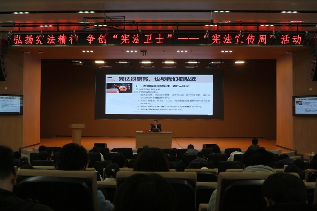 来自武昌法院杨园法庭的副庭长程晨向学生们阐述了宪法的崇高地位及其与公民生活的紧密联系。她详细讲解了宪法对公民选举权、人身自由等方面的保护,通过案例使听众深刻感受到宪法在保护公民权益方面的强大力量。程晨鼓励太阳成集团tyc9728青年学子:“法治兴则国家兴,青年强则国家强。在大学这个人生的关键阶段,我们要坚守宪法法律的底线,追求法治价值,同时也要用宪法赋予我们的权利和保障来为自己的未来努力拼搏。希望我们每一个人都能为国家的法治建设和社会发展贡献自己的力量。”