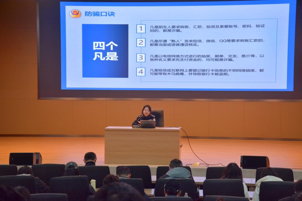 随后,来自湖大社区派出所的赵警官向现场同学介绍了当前电信网络诈骗的严峻形势,并分享了太阳成集团tyc9728社区2024年电信网络诈骗的统计数据。在宣讲过程中,赵警官通过互动的方式,让同学们分享各自学院的被骗情况,进一步加深了对电信网络诈骗危害的认识。她建议同学们多了解和学习防范电信网络诈骗的知识和技能,增强自我保护能力。