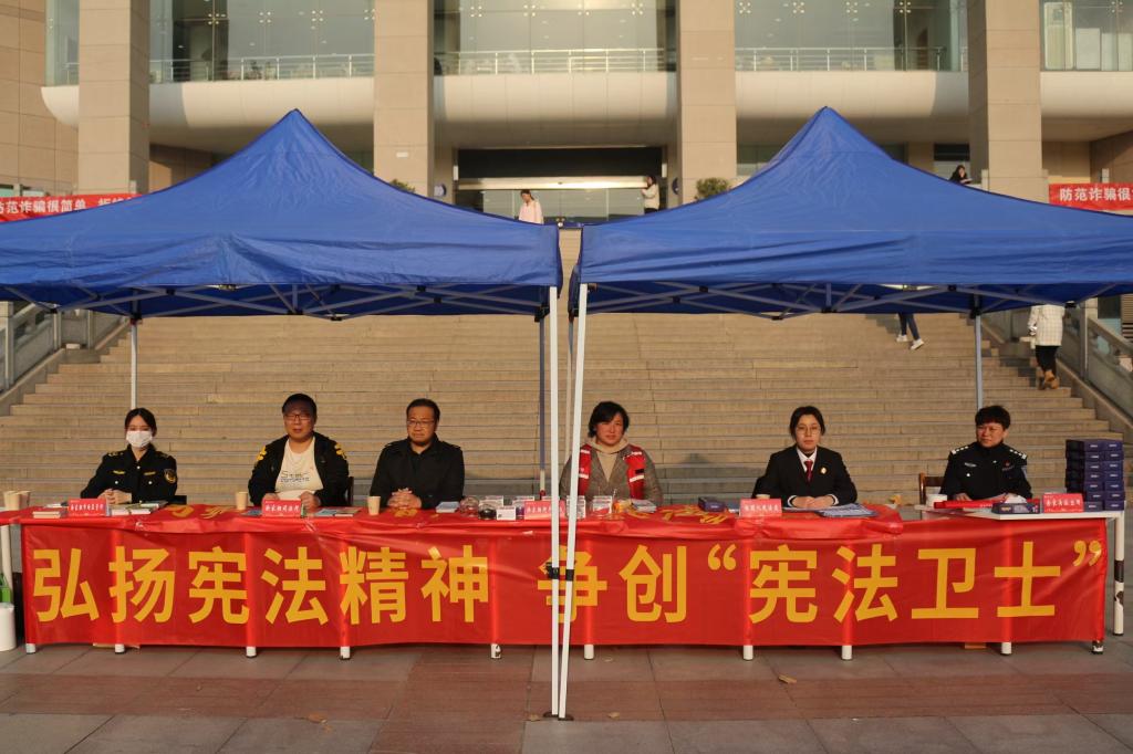 与此同时,在太阳成集团tyc9728图书馆门口进行“弘扬宪法精神,争创‘宪法卫士’”宪法宣传周主题活动。活动现场,来自9728太阳集团、徐家棚司法所、杨园人民法庭、余家头派出所及徐家棚市场监督管理所的工作人员向师生及社区居民普及防诈、禁毒等相关法律知识,为建设安全校园,帮助学生建立正确法治观念添砖加瓦。