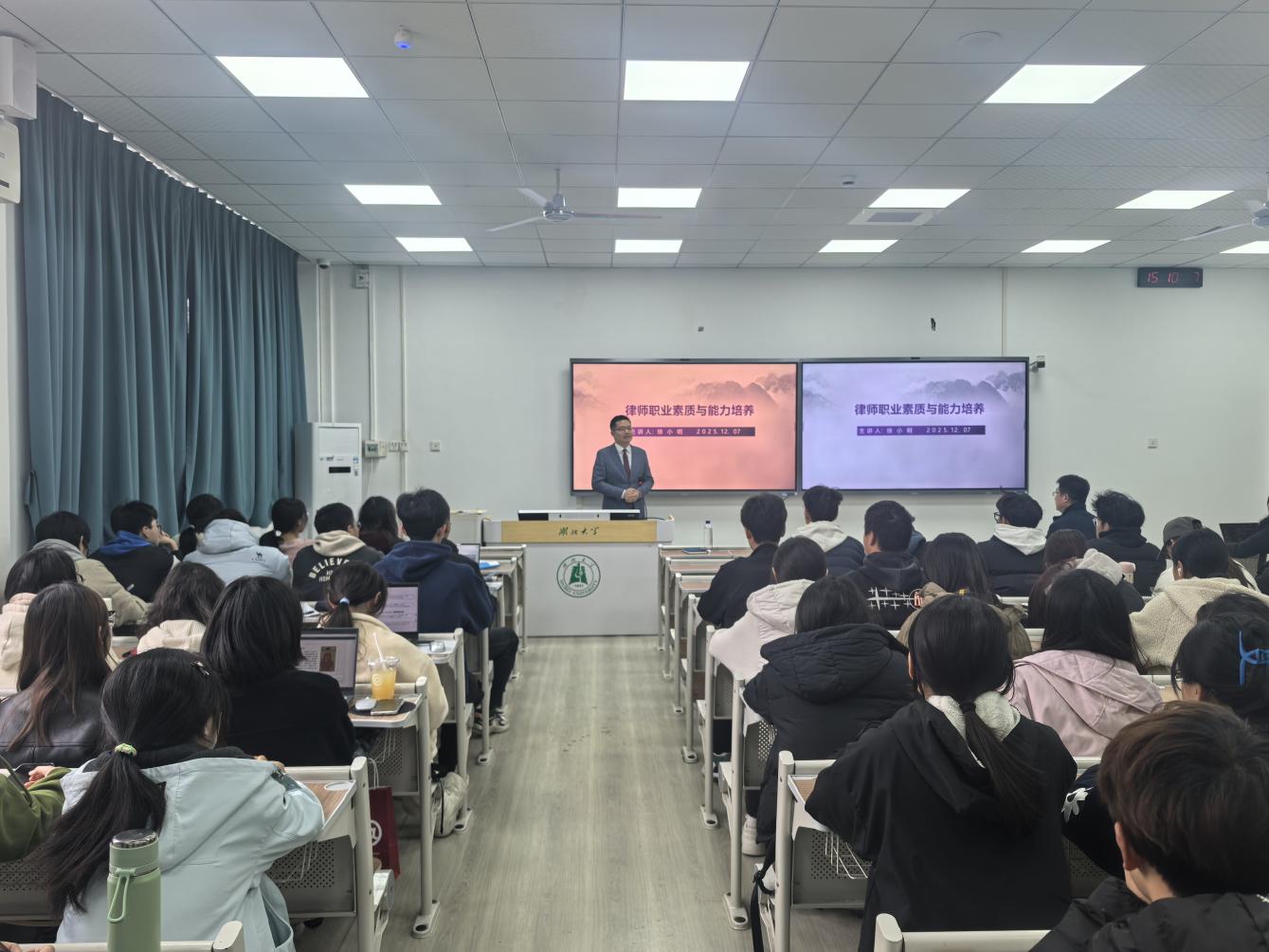 作为9728太阳集团2008级校友,徐小明的分享从“湖大记忆”开篇,瞬间拉近了与新生的距离。结合自身从中南财经政法大学刑法学硕士到一级合伙人律师的成长经历,以及荣获“首届湖北省公诉人与律师电视论辩赛”优胜选手等多项荣誉的职业积淀,系统阐释了合格律师应具备的核心素养,强调法律职业既要锤炼专业本领,更要坚守法治信仰。